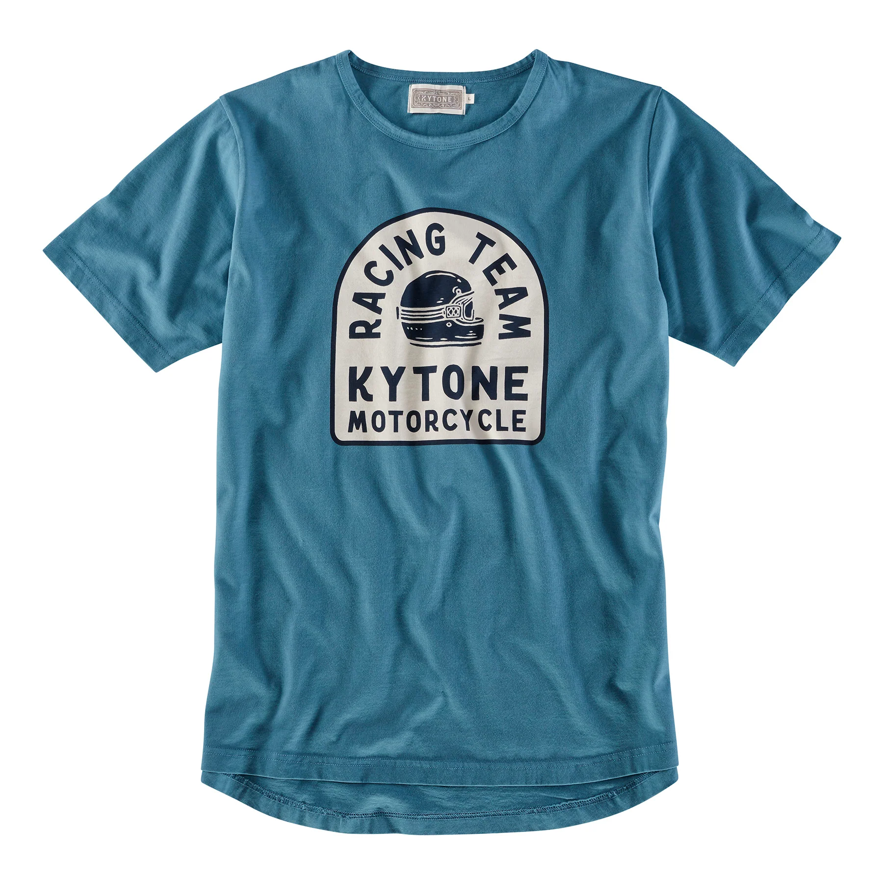 T-Shirt für Herren in Türkis von Kytone. Der Print am Vorderteil ist angelehnt an das klassische Teamshirt bei früheren Motorradrennen. Durch die leichte Vintageoptik des Drucks ist er trotz der Größe nicht zu aufdringlich. Das Rückenteil ist ein wenig länger und leicht gerundet geschnitten.