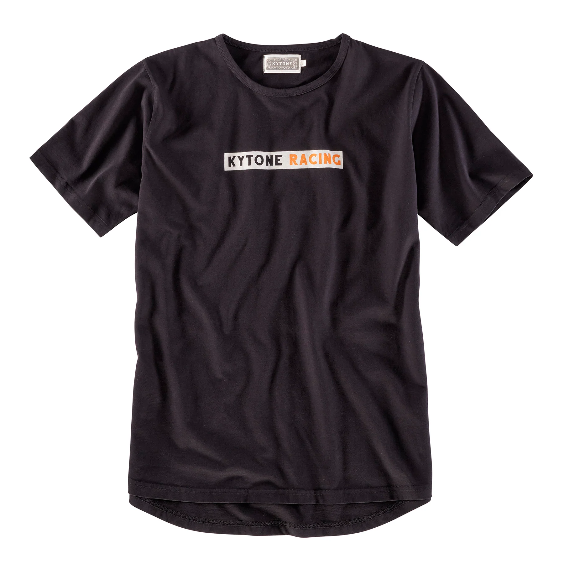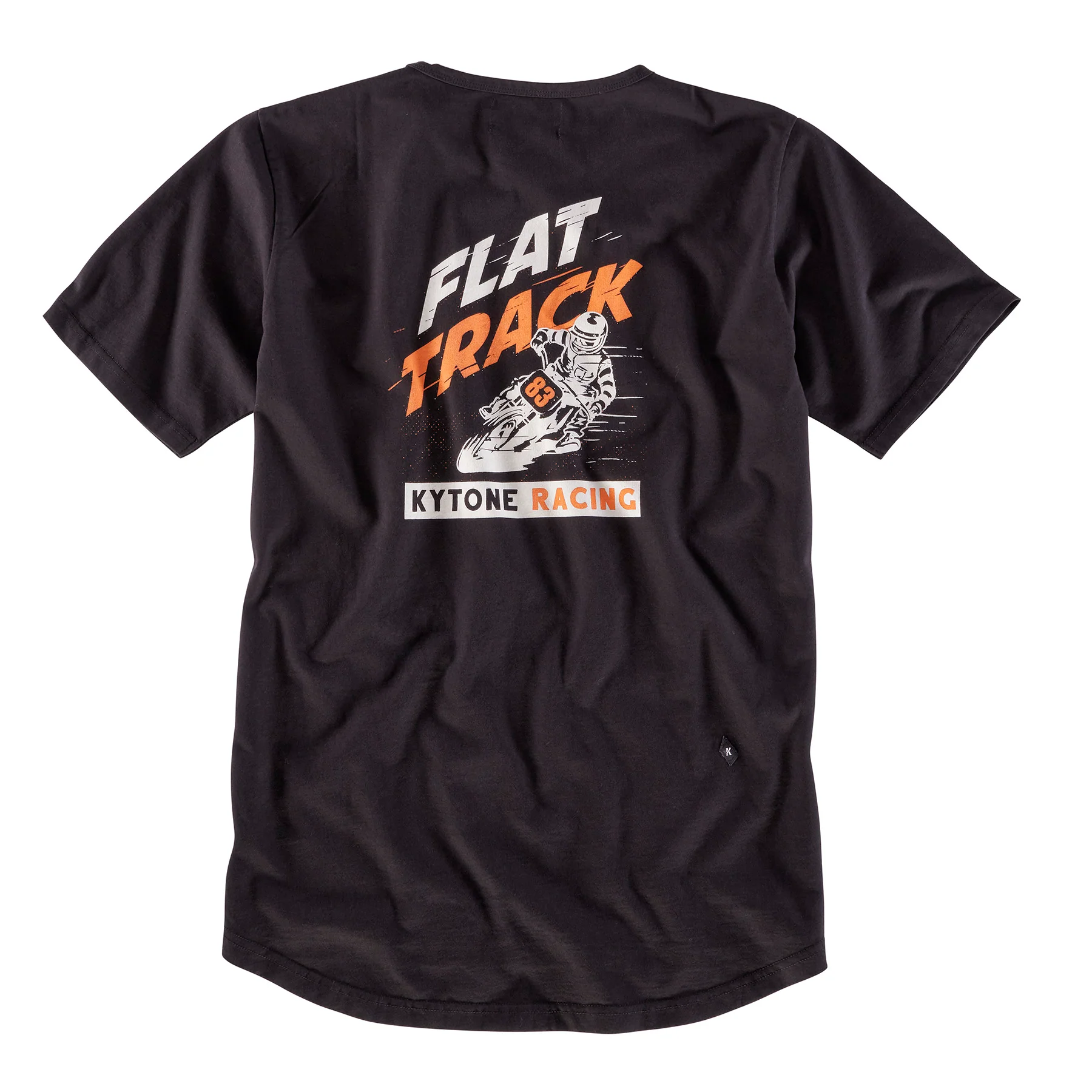 Schwarzes T-Shirt mit großem Rückenprint von Kytone. In auffälligem Orange und Weiss ist ein Flat Track Fahrer zu sehen, umgeben von einigen Schriftzügen. Auf der Brust ist im Verhältnis sehr dezent ein Balken mit einem Kytone Schriftzug aufgedruckt. Das Rückenteil ist etwas länger und leicht rund geschnitten.
