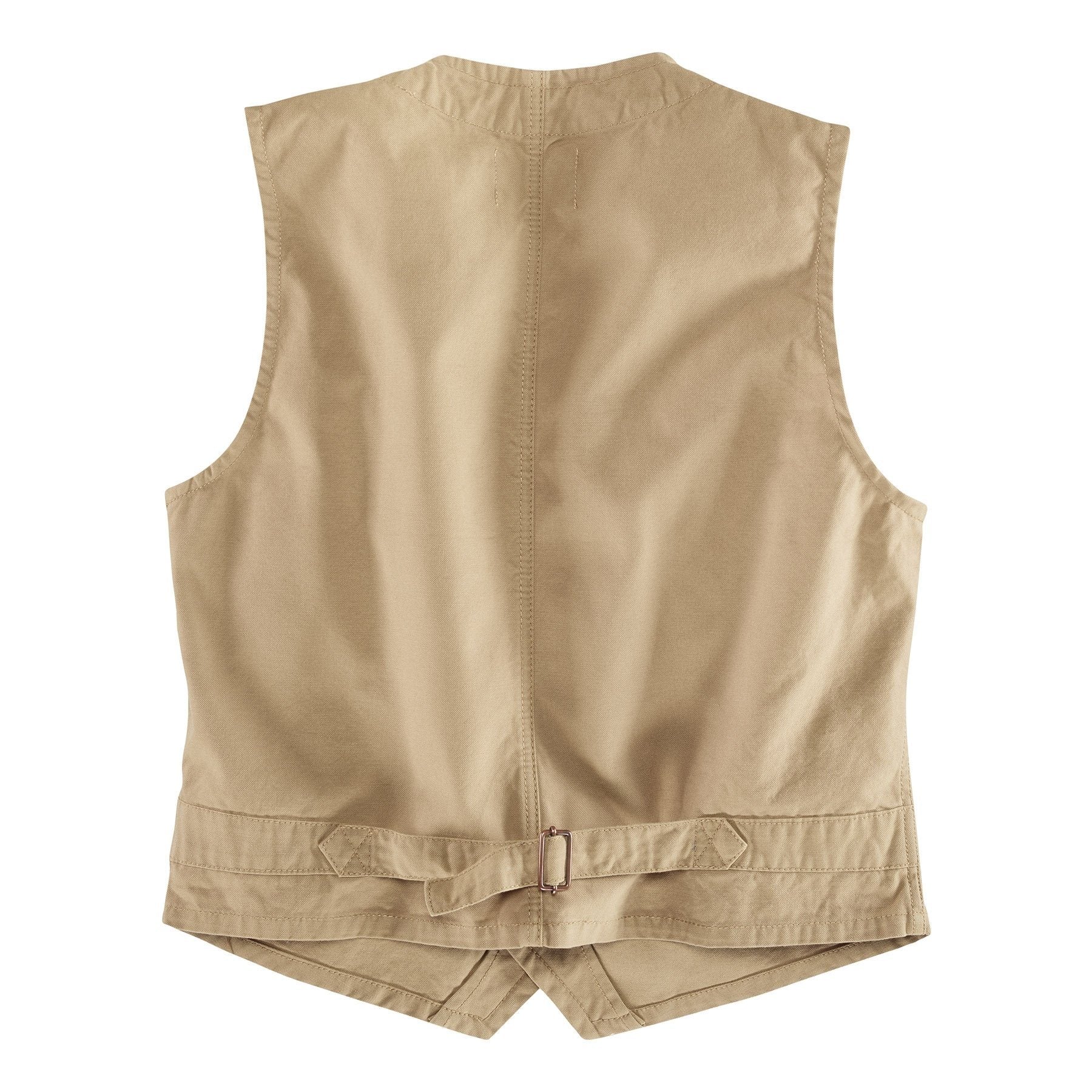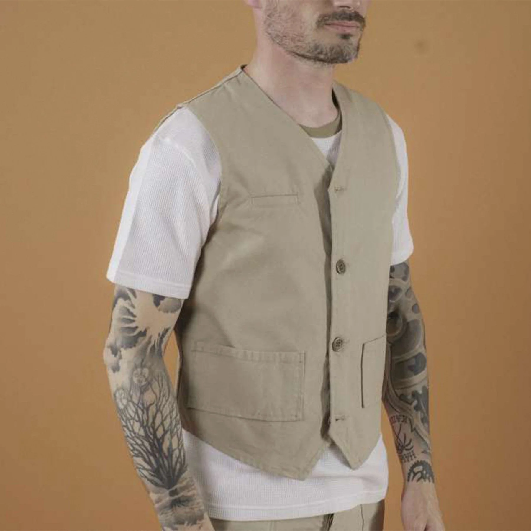 Herrenweste aus etwas festerer Baumwolle von Kytone. Der klassische Schnitt wird lässig durch die ausgefallene Taschenlösung aufgelockert, aber auch durch den traditionellen Rückengurt unterstrichen. Durch den verwendeten Canvas ist die Weste robust, ohne zu rustikal zu wirken, passend für jeden Anlass.
