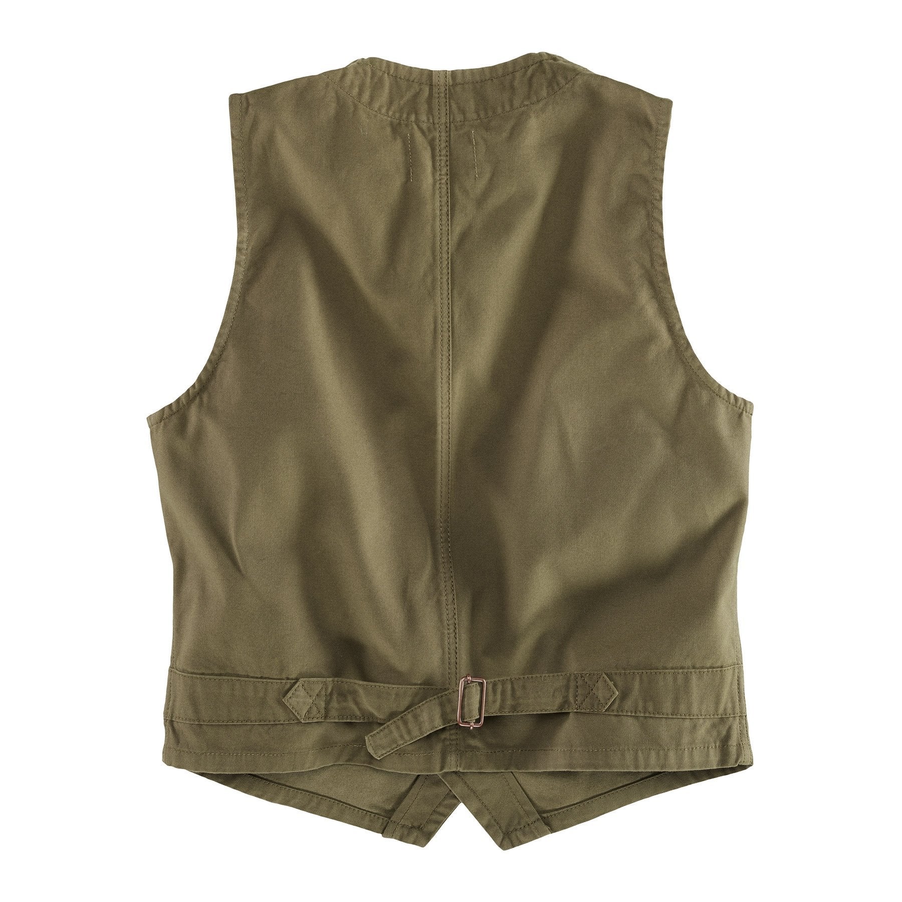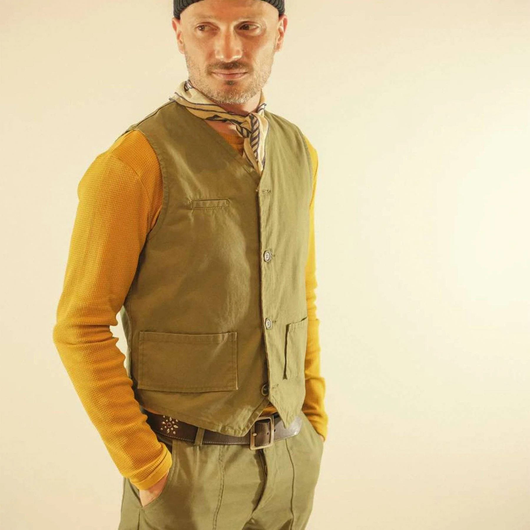 Herrenweste aus etwas festerer Baumwolle von Kytone. Der klassische Schnitt wird lässig durch die ausgefallene Taschenlösung aufgelockert, aber auch durch den traditionellen Rückengurt unterstrichen. Durch den verwendeten Canvas ist die Weste robust, ohne zu rustikal zu wirken, passend für jeden Anlass.