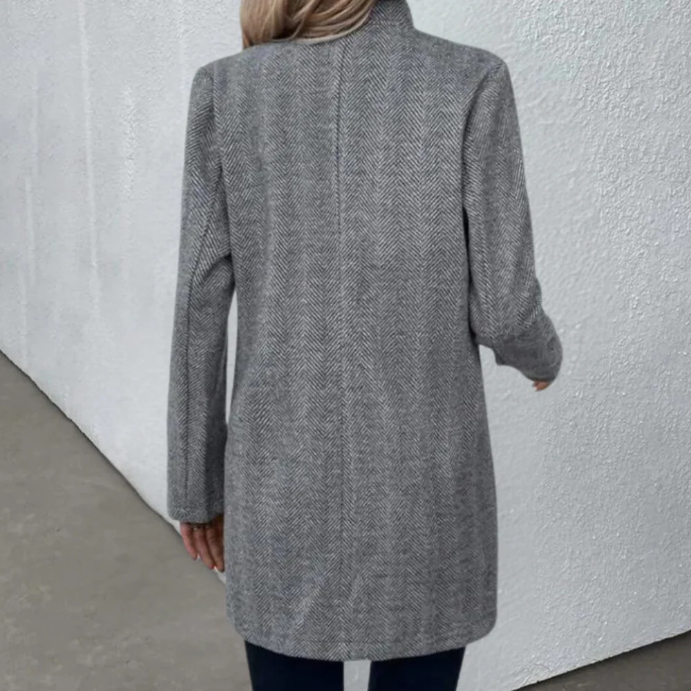 Ce manteau long pour femmes allie style minimaliste et confort, avec un col épuré et des poches zippées décorées de tirettes rondes pour un détail raffiné. Sa coupe légèrement ajustée assure une allure élégante et soignée, parfaite pour des occasions formelles ou décontractées.