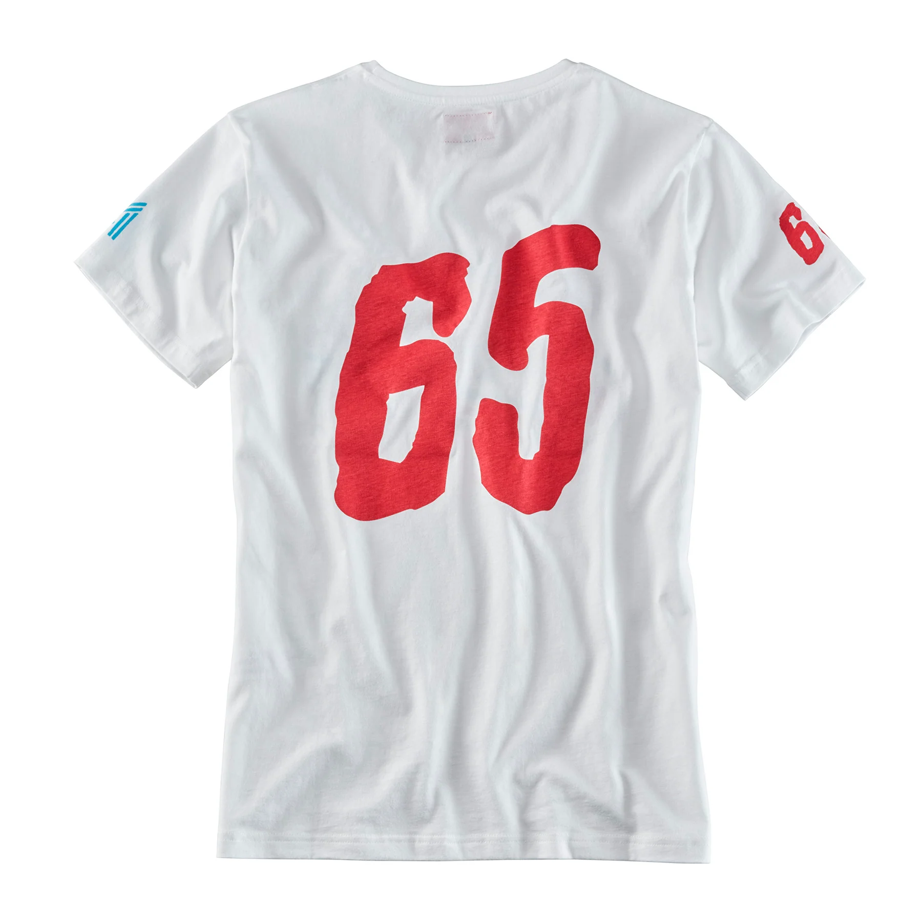 T-Shirt mit großem Print von Maria Riding Company. Die gewählten Farben Rot, Grau und Blau sind zwar kräftig aber eher gedeckt, wodurch der Druck auffällig aber dennoch edel wirkt. Auch die große « 65 » am Rückenteil in dunklem Rot trägt zu einer eher gepflegten Optik bei.