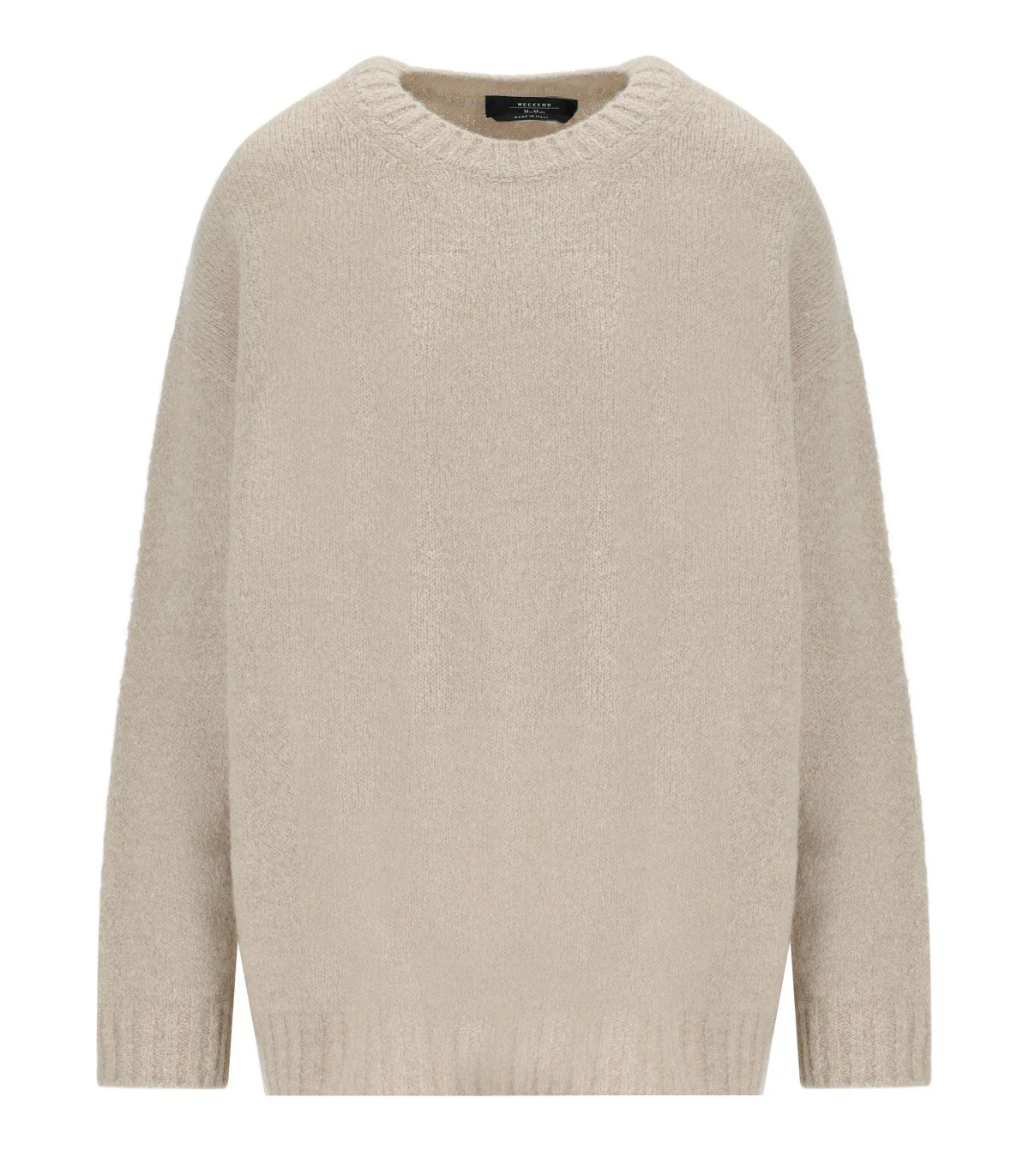 Max Mara Weekend Pesco sweater made from beige alpaca-blend yarn, featuring ribbed trim and an oversized fit.