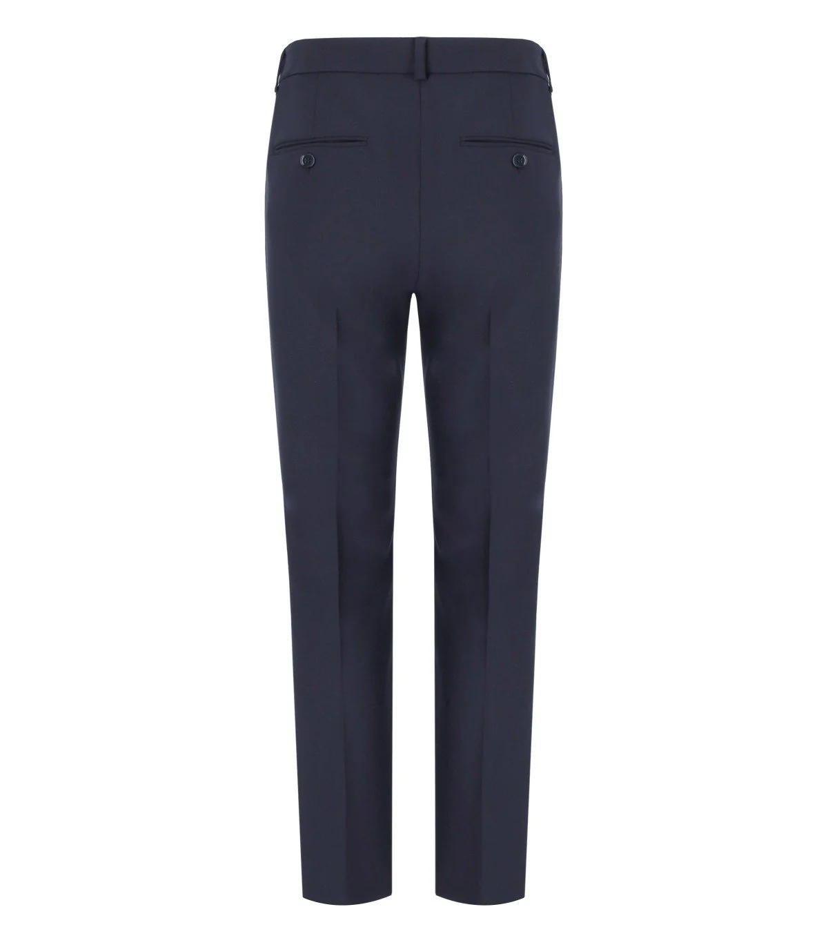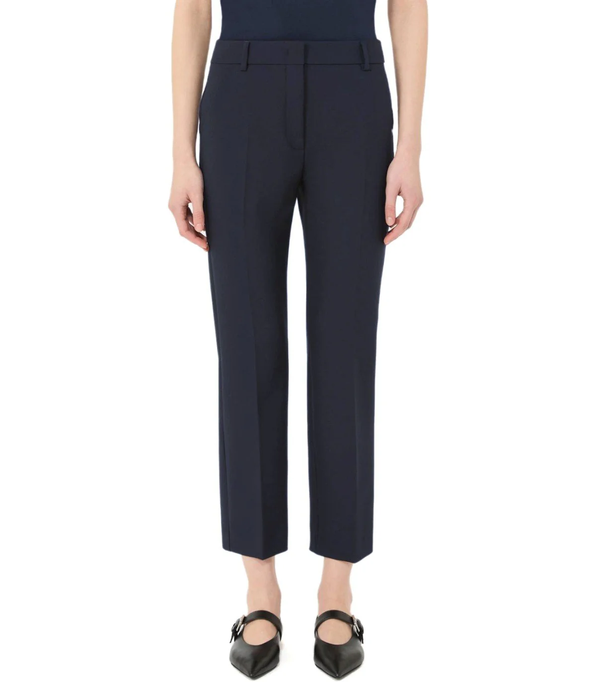 Max Mara Weekend Rana trousers made from a viscose blend in shades of blue. Featuring a zip and metal hook fastening, pressed crease, and French-style side pockets. Equipped with belt loops and welt pockets with buttons on the back. Cropped at the ankle. Regular fit.