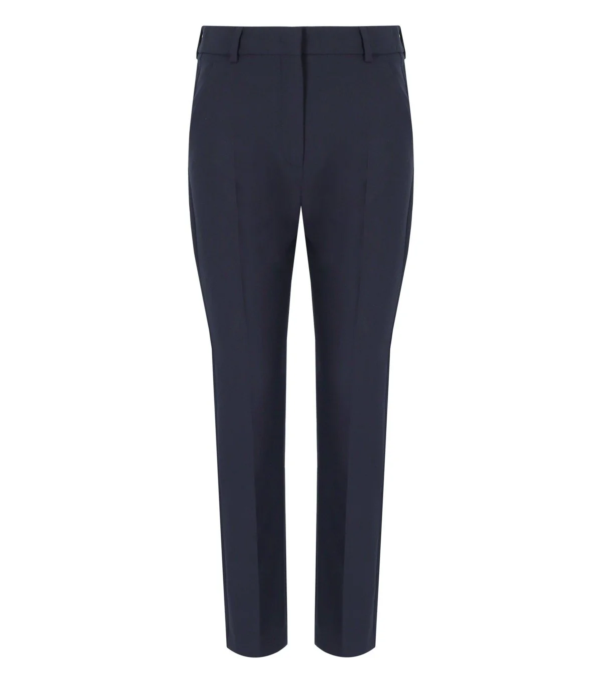 Max Mara Weekend Rana trousers made from a viscose blend in shades of blue. Featuring a zip and metal hook fastening, pressed crease, and French-style side pockets. Equipped with belt loops and welt pockets with buttons on the back. Cropped at the ankle. Regular fit. Composition: 72% polyester, 21% viscose, 7% elastane.