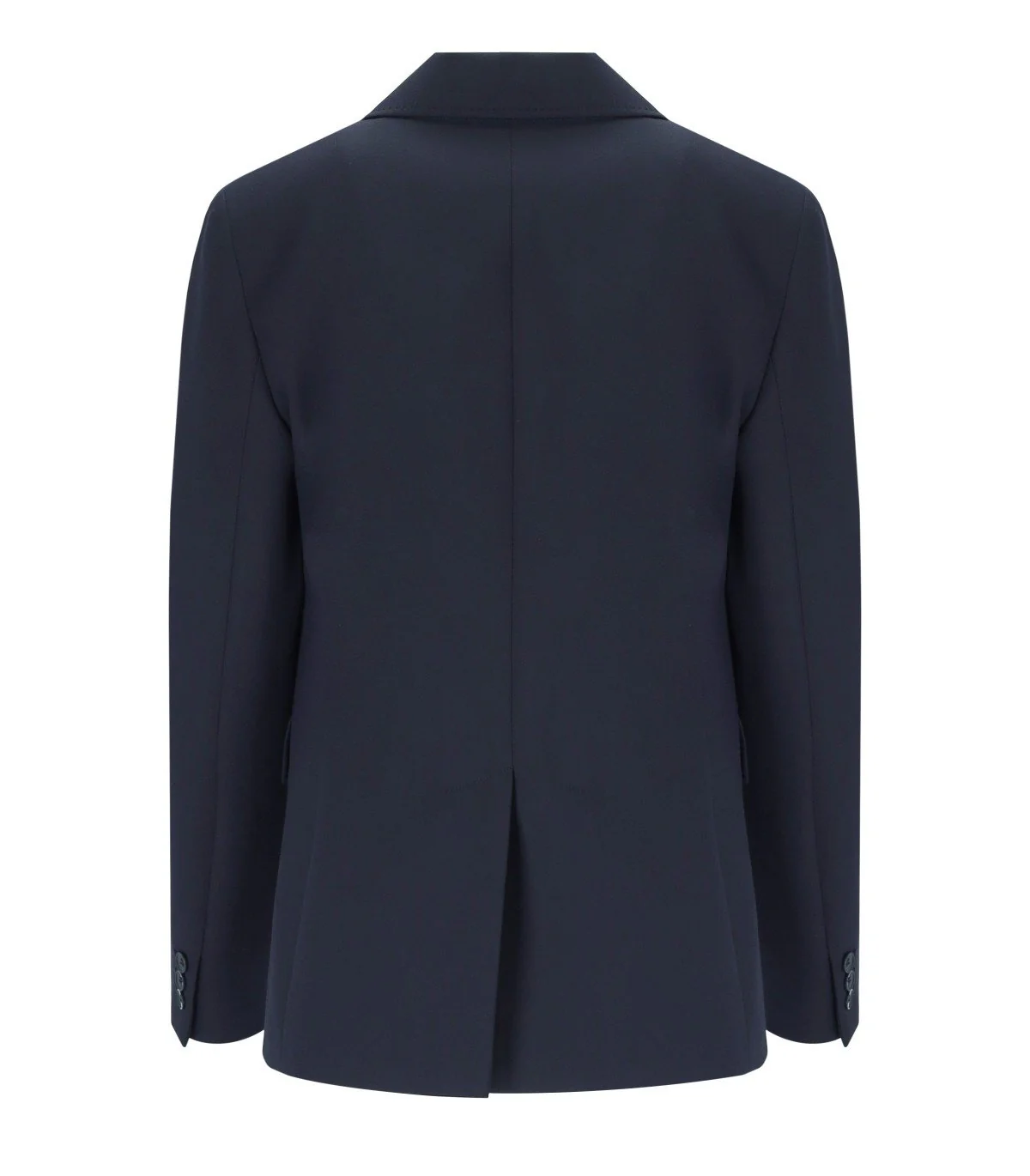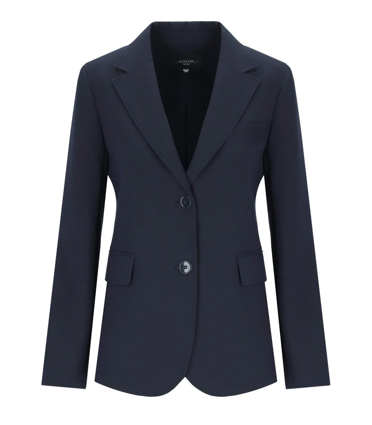 Max Mara Weekend Uva blazer made of blue viscose blend, lined, featuring a notched lapel collar and single-breasted button closure. Fitted silhouette with back vent. Composition: 72% polyester, 21% viscose, 7% elastane; lining 100% polyester.