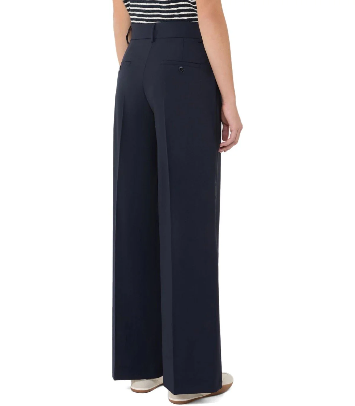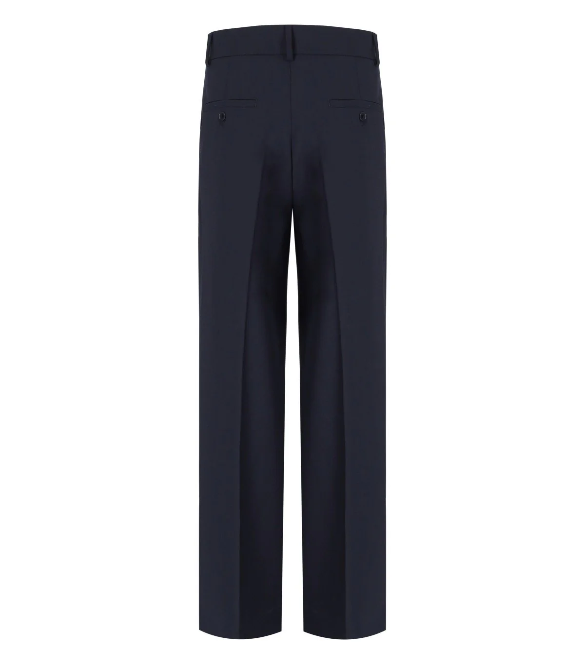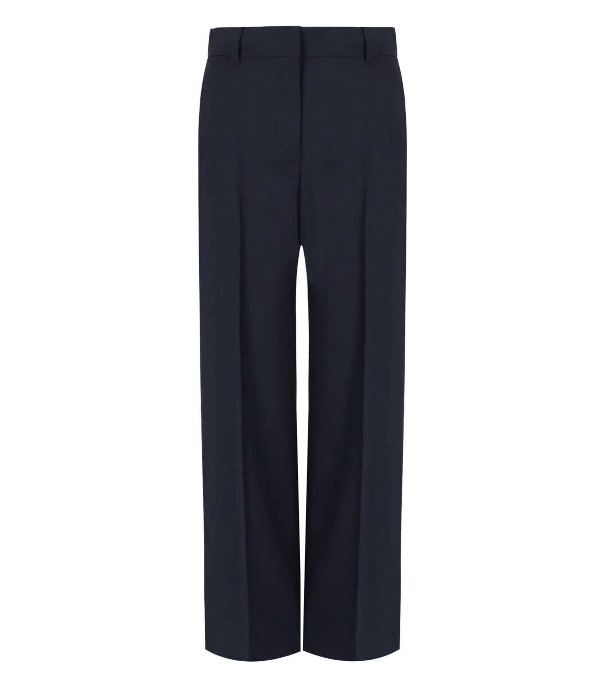 Max Mara Weekend Visivo trousers made from virgin wool in shades of blue. They feature a straight leg, pressed crease, and slanted side pockets. Equipped with belt loops, a zip-and-hook fastening, and back welt pockets with a button. Comfortable fit.