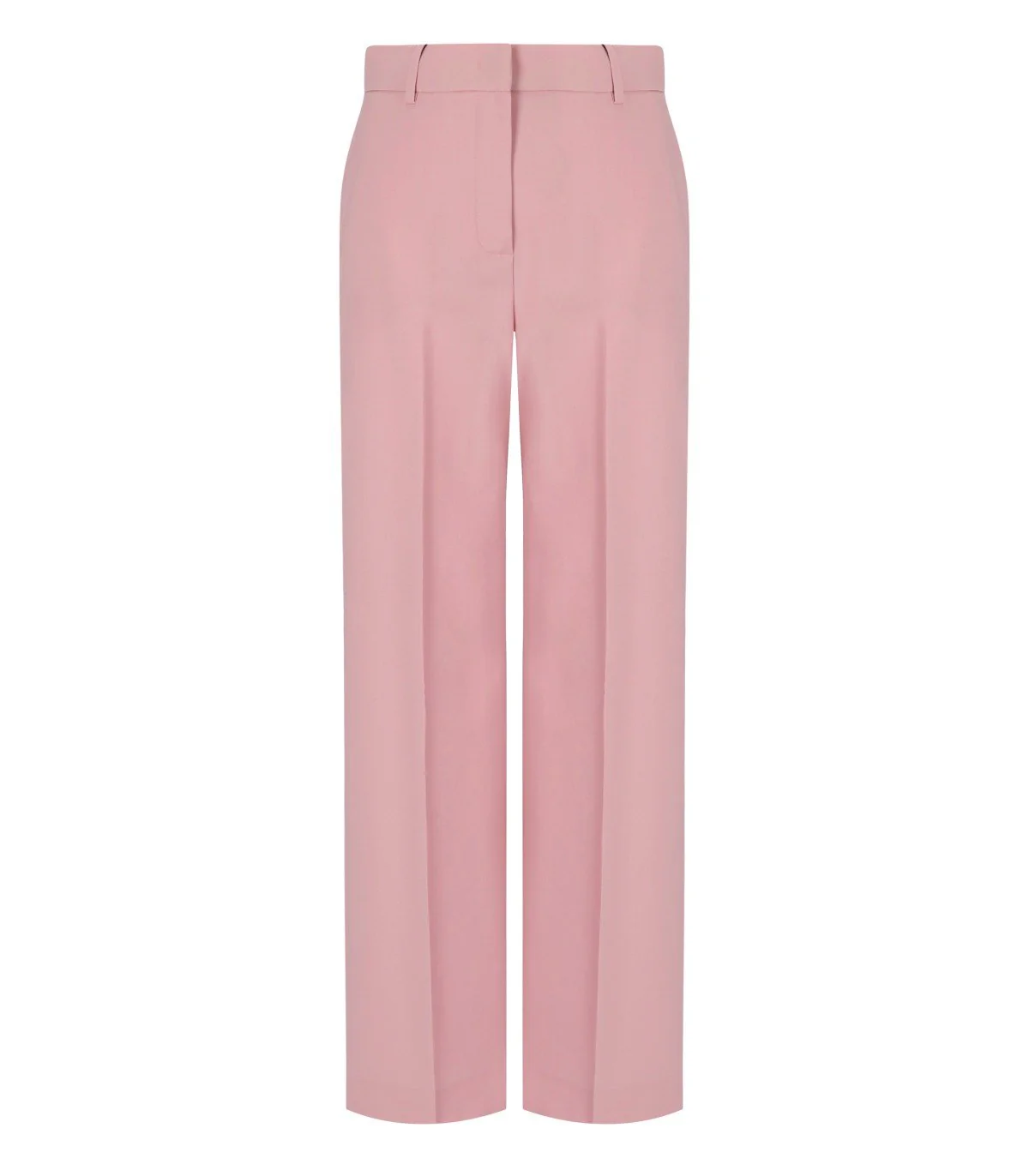 Max Mara Weekend Visivo trousers made from virgin wool in shades of pink. They feature a straight leg, pressed crease, and French pockets on the sides. Equipped with belt loops, a zip-and-hook fastening, and rear welt pockets with a button. Comfortable fit.