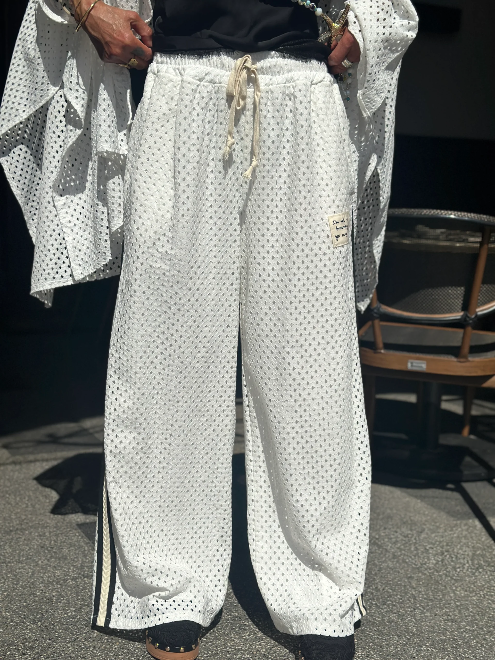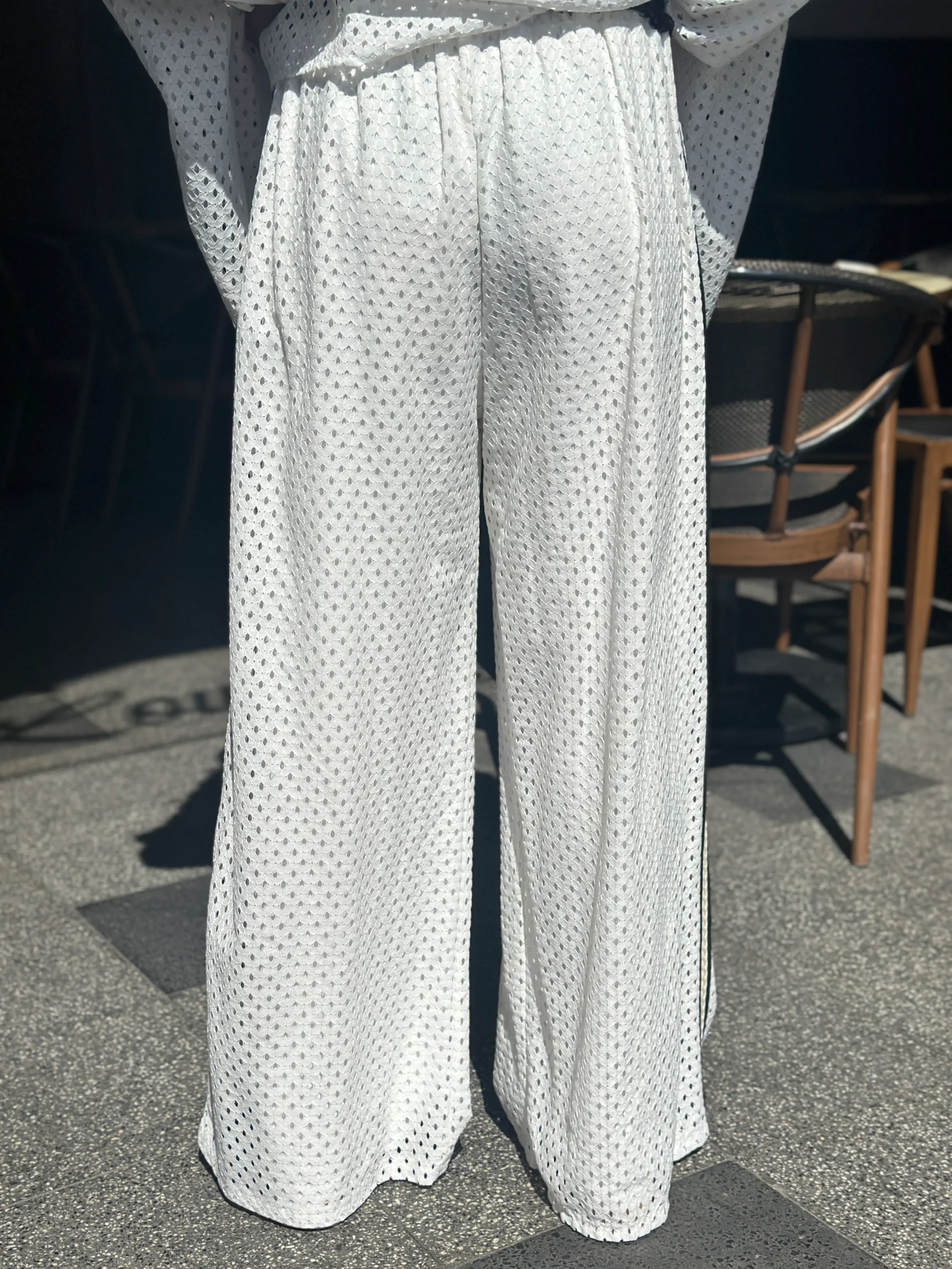 . Coupe évasée ajourée, pantalon doublé, patch plaqué coordonné à la chemise, poches latérales