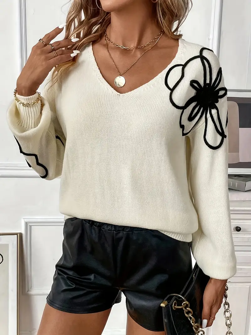 Pull Fleuri à Col en V pour Femmes