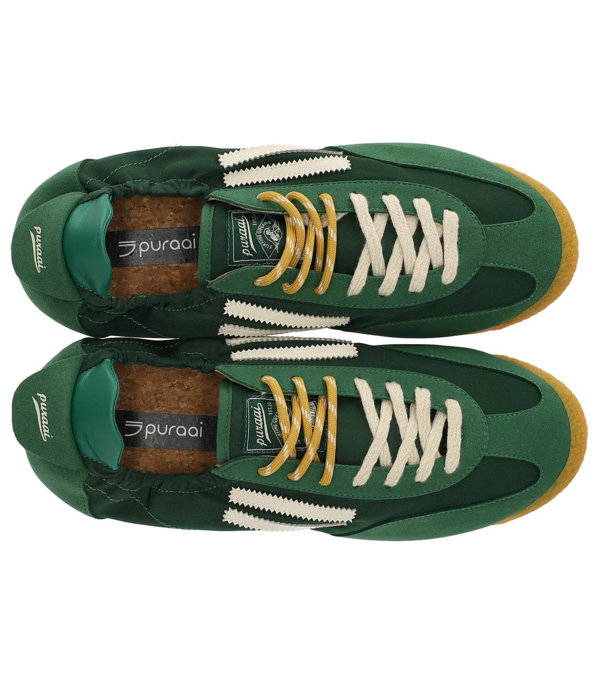 Puraai Panther sneaker made of lightweight canvas with vegan synthetic leather inserts in shades of green. Features two different types of cotton laces. It has a branded heel with a green leather-effect finish, a fabric tongue and lining, and a branded natural cork insole. The upper is embellished with a white vegan leather logo. Rubber sole. Height: 2 cm.