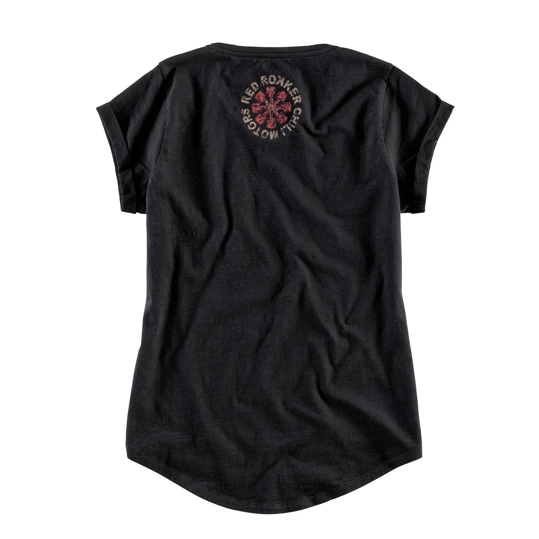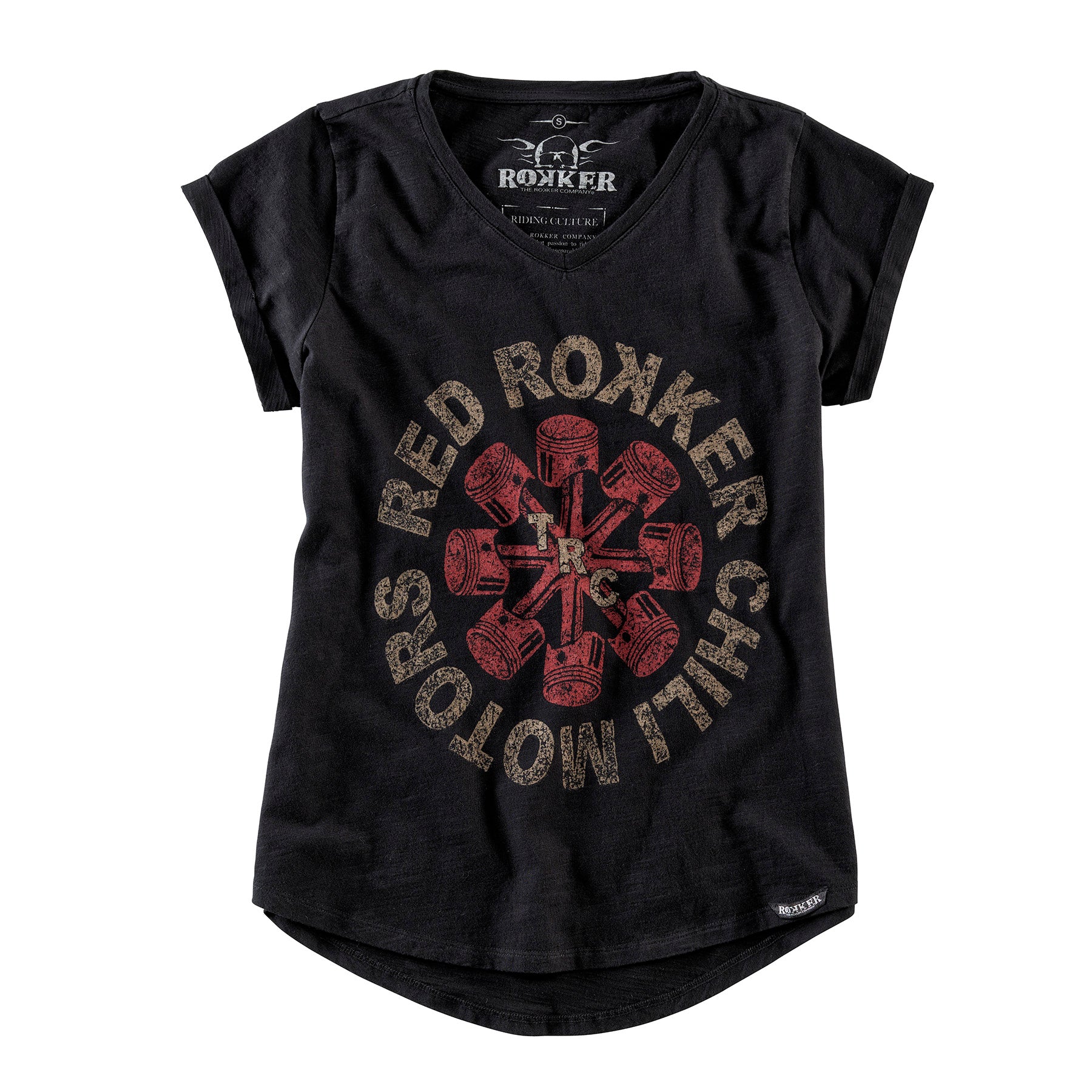 Damenshirt mit V-Ausschnitt von The Rokker Company. Relativ gerade geschnitten mit etwas kürzeren Ärmeln mit kleinem Umschlag sitzt es durch den runden Bund besonders lässig und bequem, macht aber trotzdem eine gute Figur. Der Print am Vorderteil ist an eine Rockband angelehnt, wirkt aber durch die Used Optik nicht zu aufdringlich oder gar plakativ. Das selbe Motiv findet sich in kleinerer Form auch am hinteren Halsausschnitt wieder.