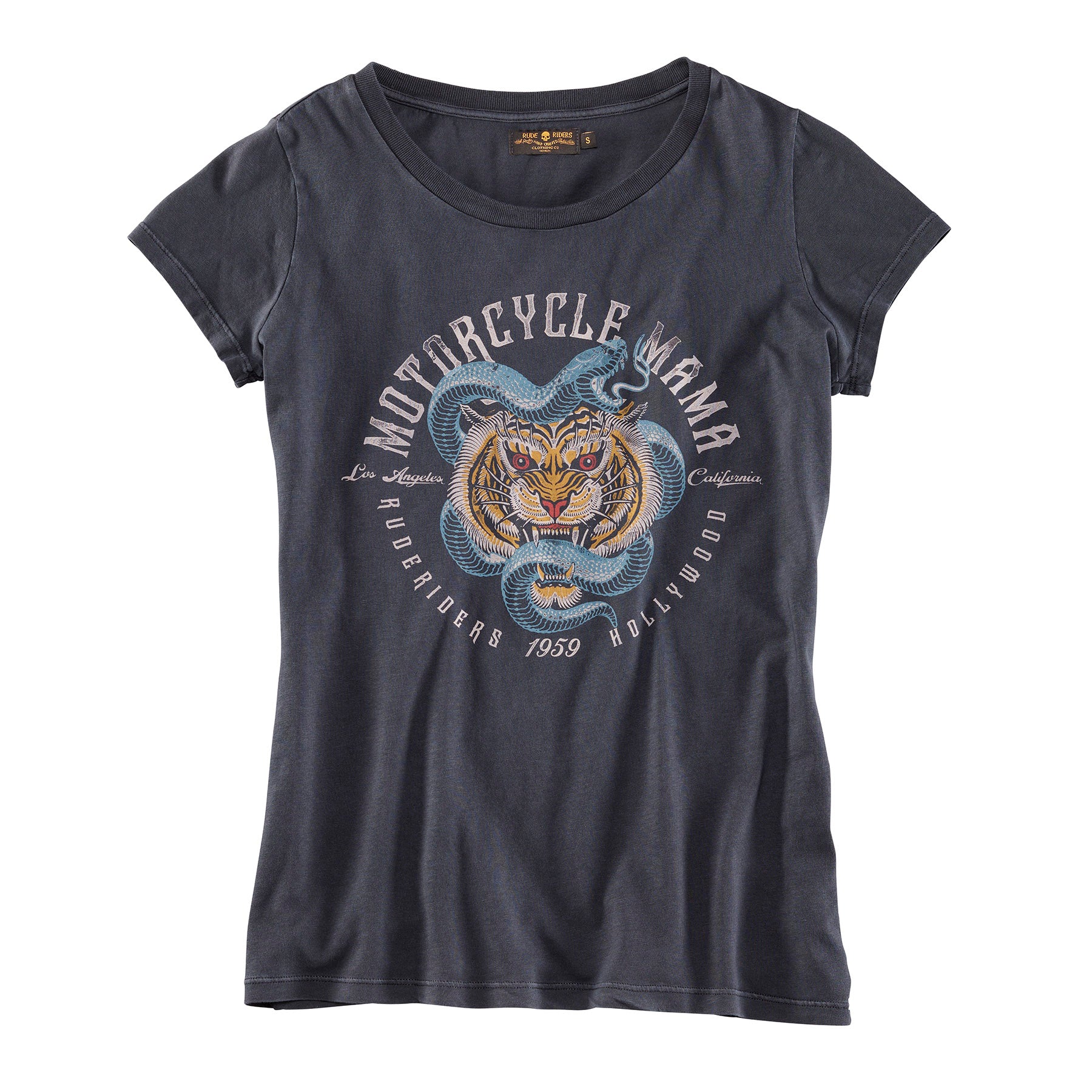 Schwarzes T-Shirt für Damen von Ruderiders. In leichtem Used Look ist auf der Vorderseite ein Tigerkopf mit Schlange zu sehen, umrundet von einem Schriftzug. Der Print am Rücken erinnert endlich deutlich daran, motorradfahrende Frauen niemals zu unterschätzen. Leichte aber nicht zu dünne Baumwolle.