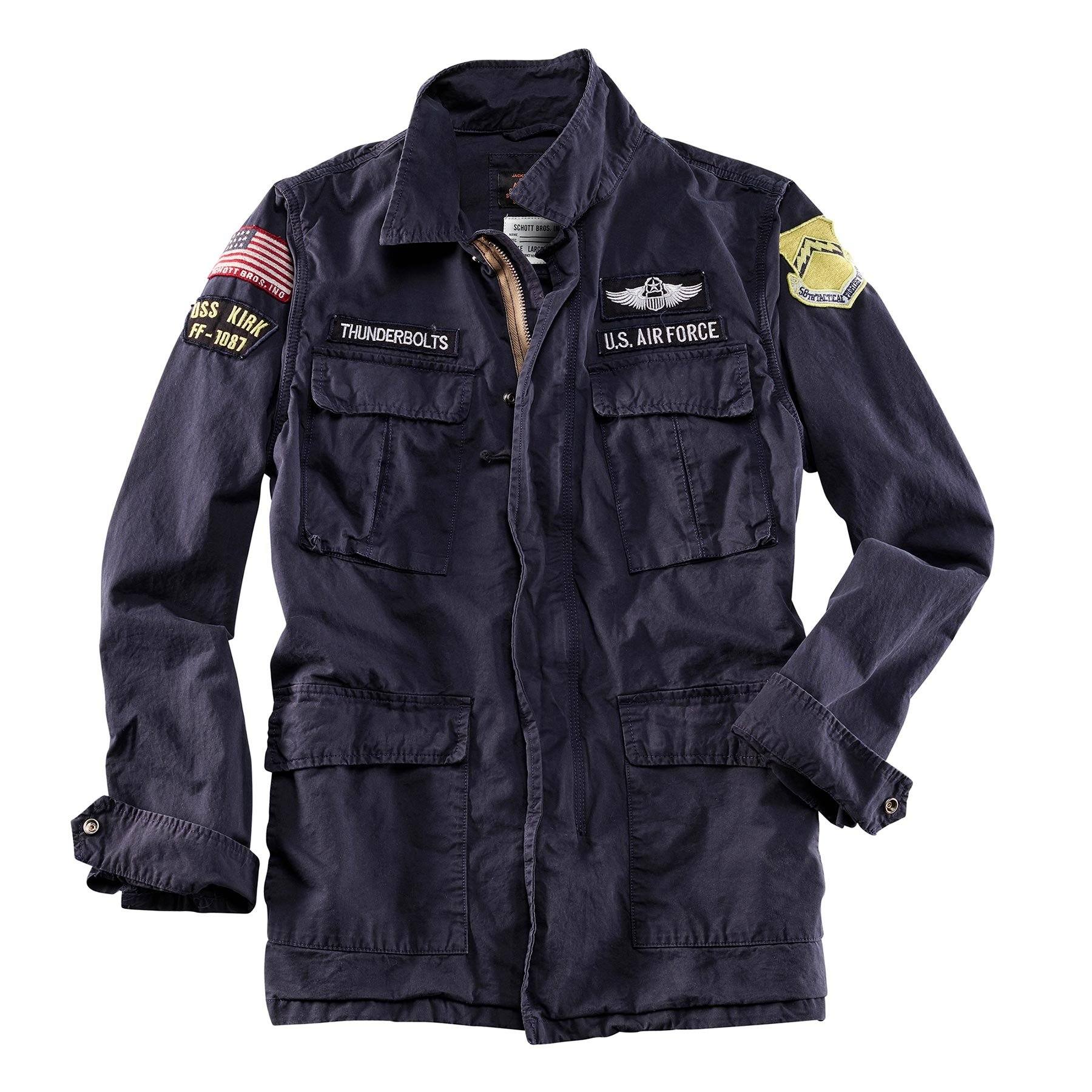Dunkelblaue Baumwolljacke von Schott NYC. Diverse Patches am Vorderteil und den Ärmeln unterstreichen den lässigen Military-Stil. Große aufgesetzte Taschen mit Patte und doppeltem Eingriff sowie zwei Innentaschen bieten ausreichend Stauraum. Durch die gewaschene Baumwolle erhält die Jacke eine sehr lässige Vintage Optik, bleibt aber dennoch gepflegt.