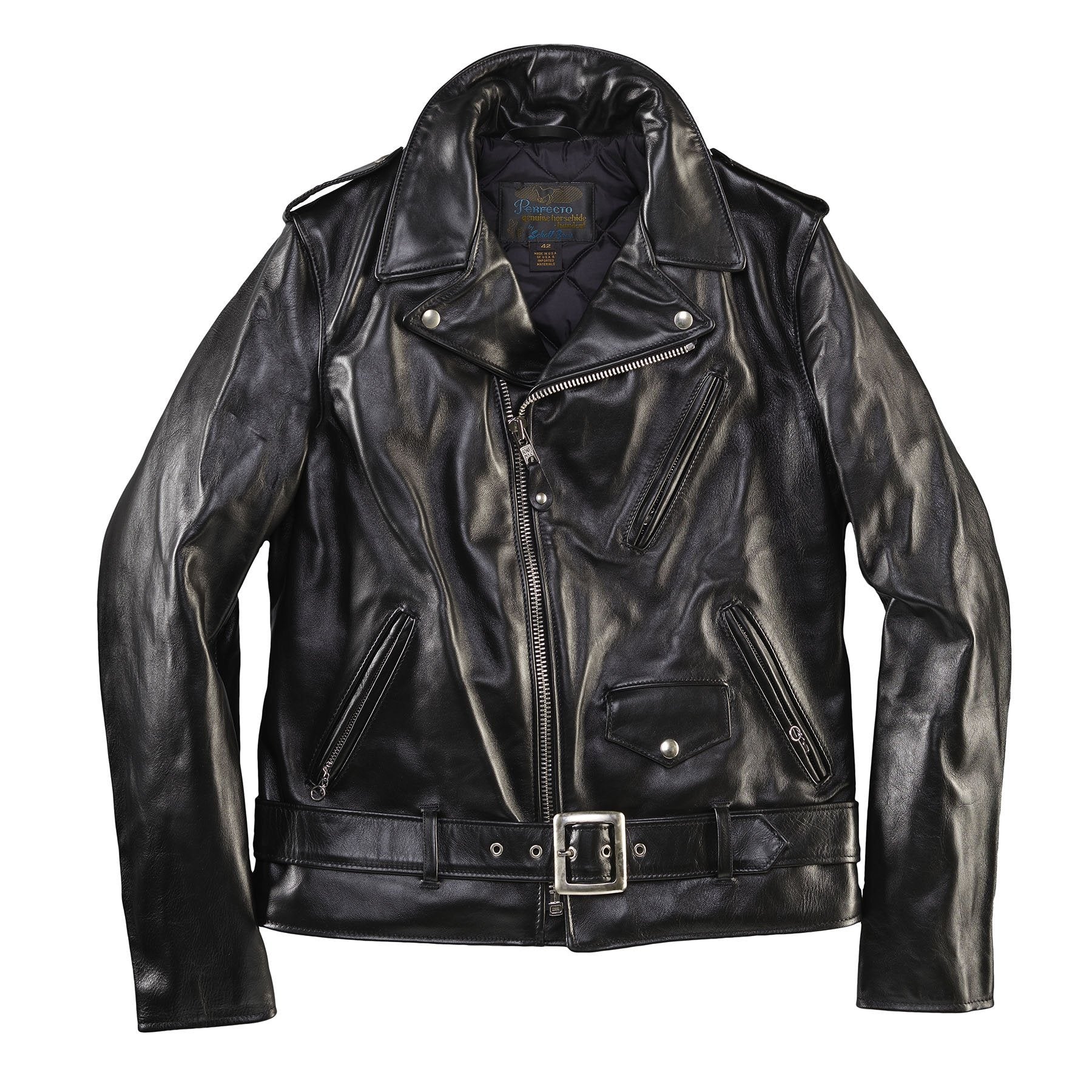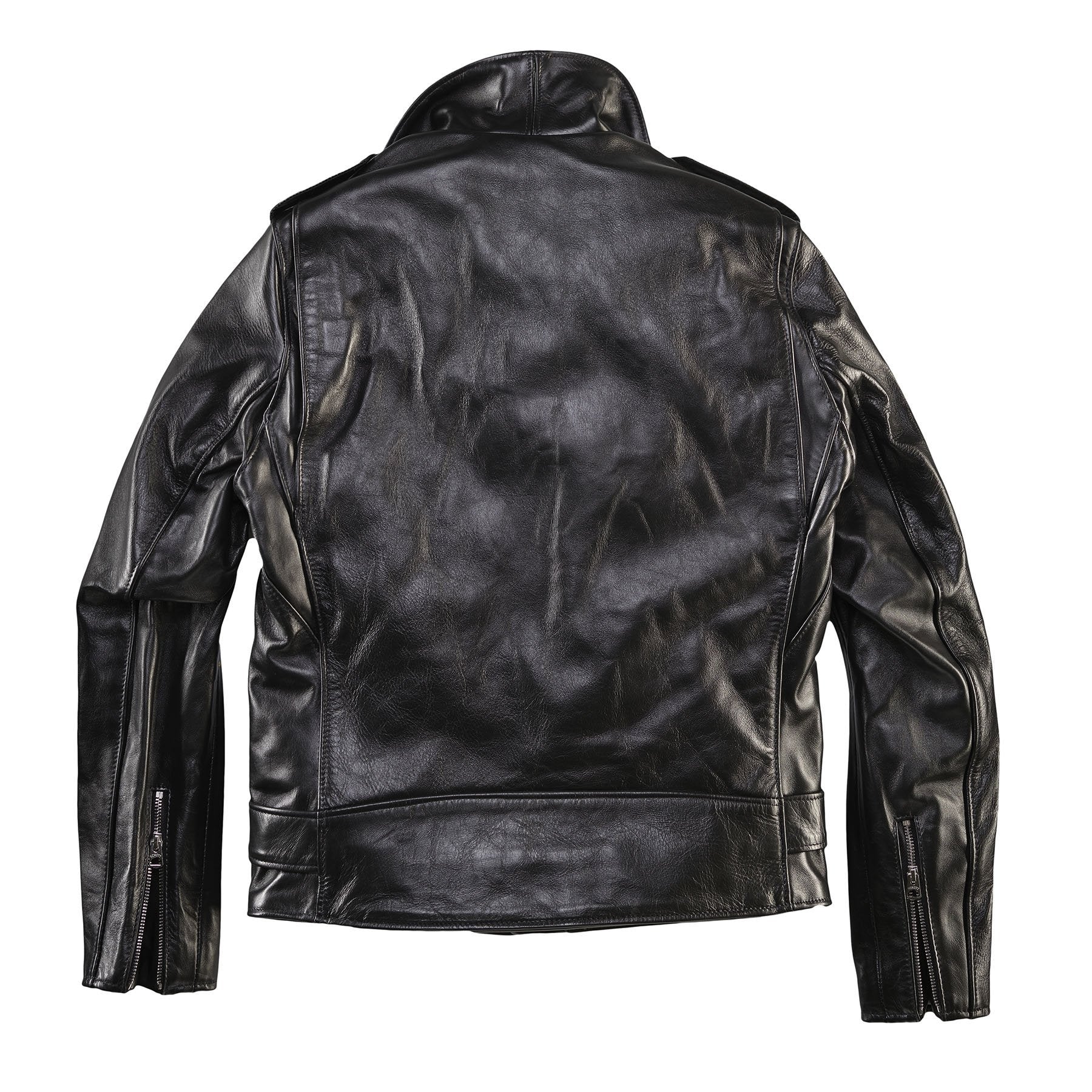 Pferdelederjacke von Schott N.Y.C. Ein wenig kürzer geschnitten als der Klassiker sind alle Merkmale wie der schräge Reissverschluss, der Umlegekragen mit Druckknöpfen oder der Gürtel mit Schnalle vorhanden. Ein leicht wattiertes Steppfutter sorgt für ein angenehmes Tragegefühl und die entsprechende Wärme. Durch das verwendete Leder ist die Jacke anfangs etwas steifer und bockig, ist jedoch durch ein spezielles Finish wasserabweisend.