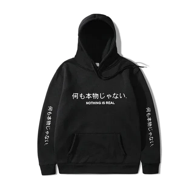 Avec son message « Rien n’est réel », ce sweat n’est pas qu’un simple vêtement. Il exprime une philosophie intrigante tout en conservant un design épuré. Que ce soit pour sortir en ville ou pour une soirée entre amis, ce sweat vous permet d’afficher votre individualité de manière subtile mais marquante. Ce détail d’écriture japonaise s’intègre parfaitement dans un style streetwear ou urban chic, ajoutant une touche d’énigme à votre look.