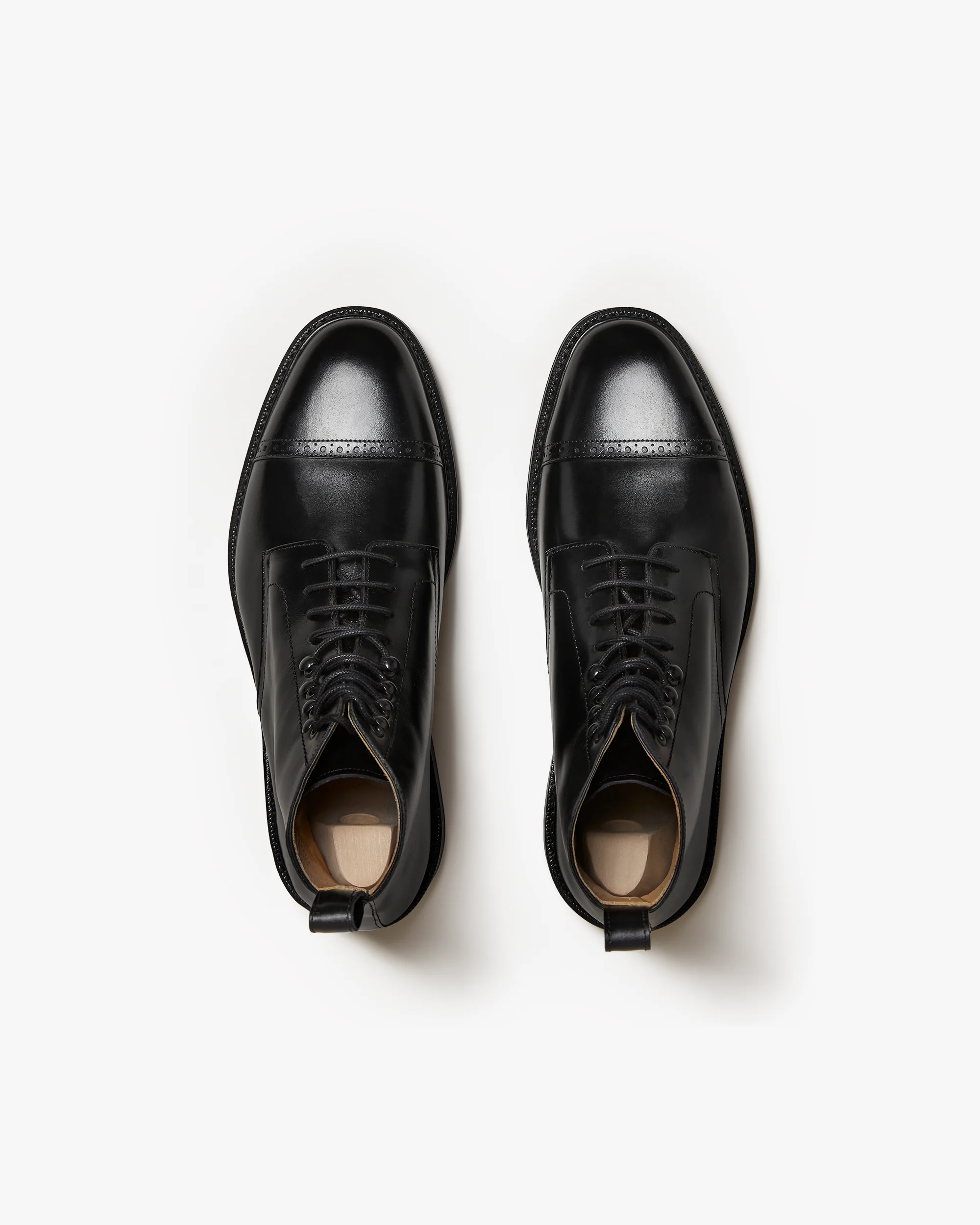 Tjärnö II in black calf is a study in functional elegance, where the classic cap-toe boot is reinterpreted with Scandinavian clarity. Crafted from full-grain calf leather, its silhouette is defined by refined brogue detailing that adds a touch of character without compromising its clean lines. The deep black hue and smooth finish create a versatile foundation for a range of considered wardrobes.
