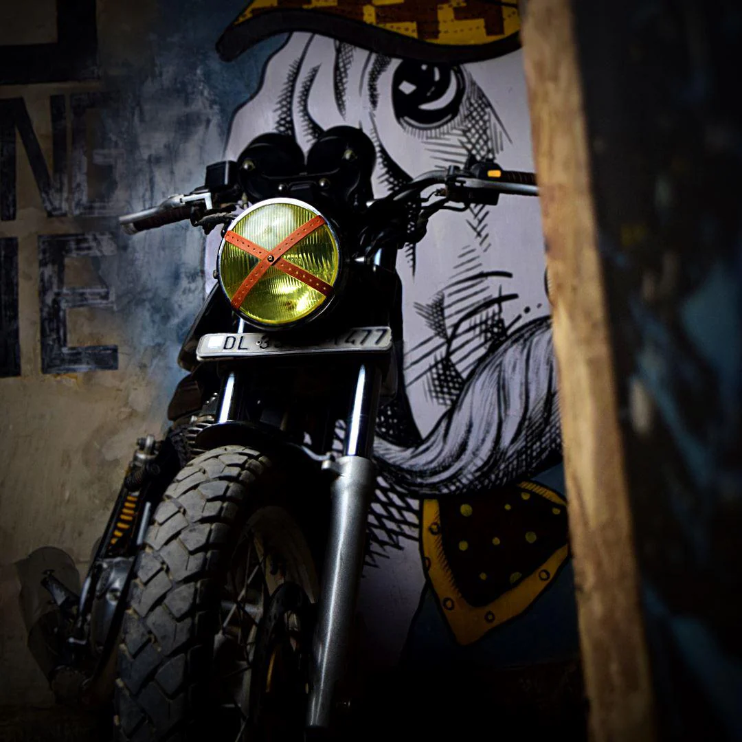Headlight X Tape vom indischen Label Trip Machine. Eine Hommage an die Rennfahrer der guten alten Zeit, die den Look der Cafe Racer der heutigen Tage vornehmlich mit beeinflusst haben. Das verwendete Hochleistungsklebeband von 3M sorgt für verlässlichen Halt. Ca. 19 cm lang.