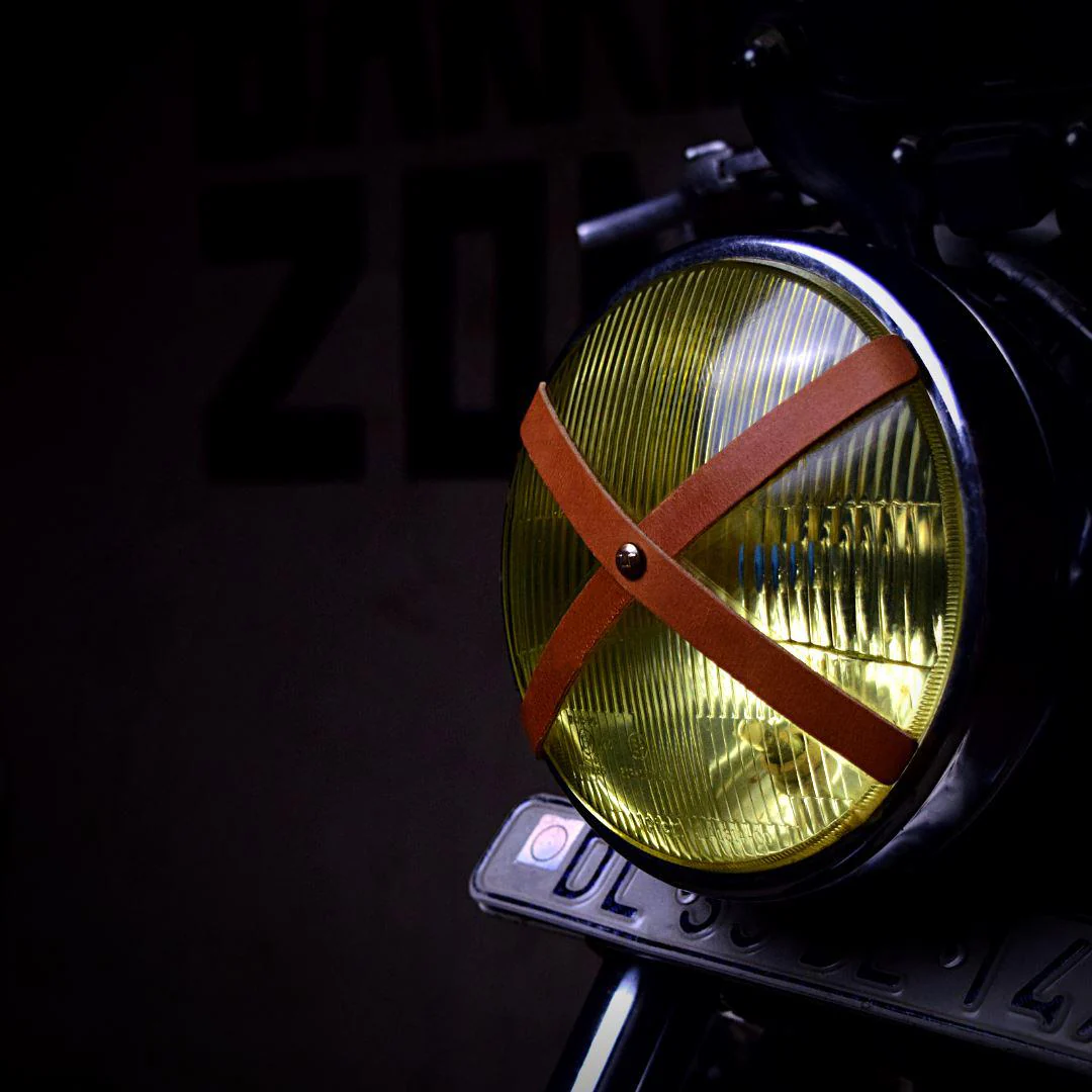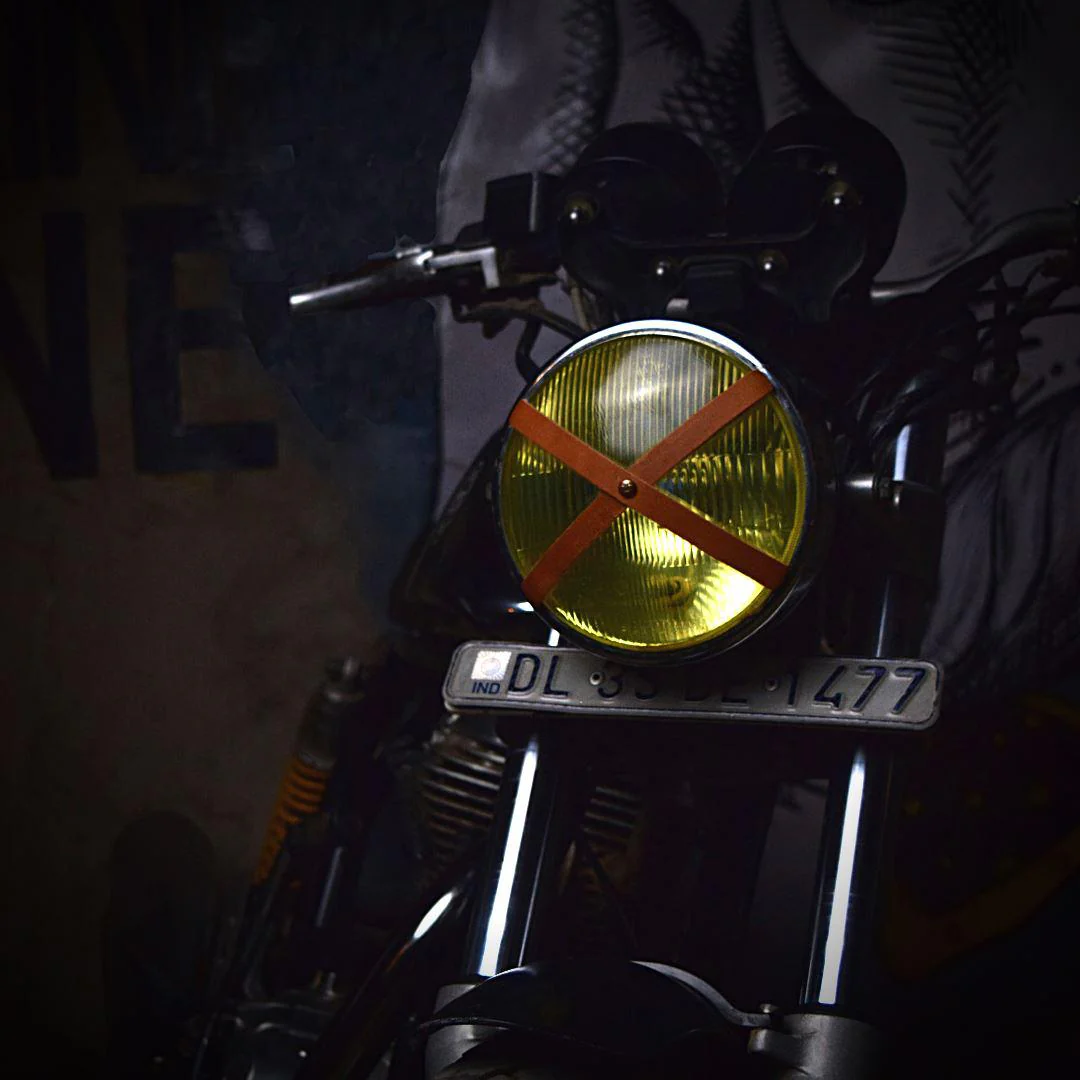 Headlight X Tape vom indischen Label Trip Machine. Eine Hommage an die Rennfahrer der guten alten Zeit, die den Look der Cafe Racer der heutigen Tage vornehmlich mit beeinflusst haben. Das verwendete Hochleistungsklebeband von 3M sorgt für verlässlichen Halt. Ca. 19 cm lang.