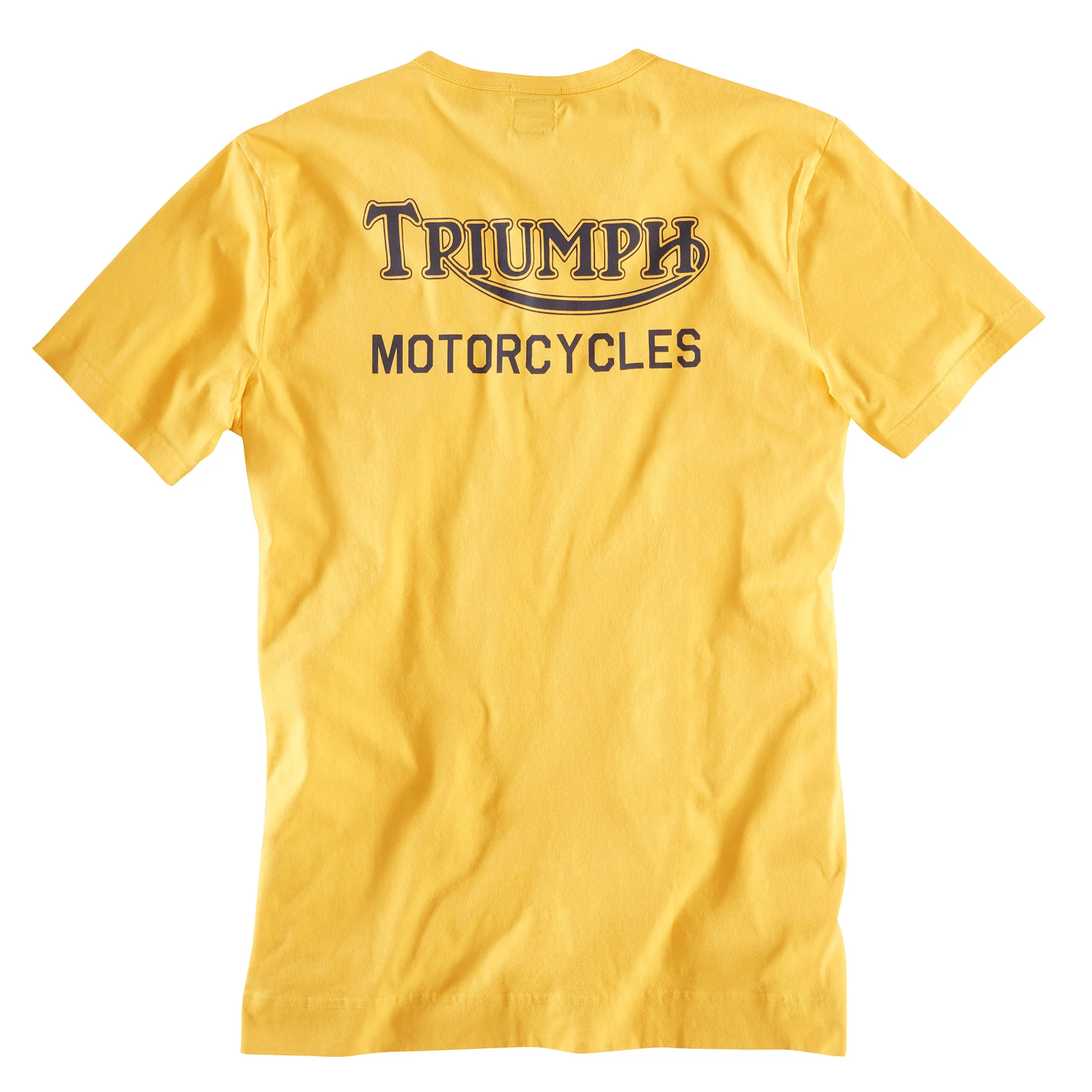 Herrenshirt in sonnengelb von Triumph Motorcycles. An der linken Brust ist in Blau das klassische Triumph Logo relativ dezent aufgedruckt. Das selbe Motiv ist in groß über den gesamten Rücken zu sehen. Angenehm weiche Baumwolle, nicht zu dünn aber trotzdem leicht.